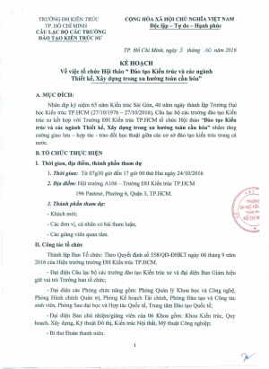 Nhân dịp kỷ niệm 65 năm Kiến trúc Sài Gòn, 40 năm thành lập Trường Đại học Kiến trúc TP.Hồ Chí Minh (27/10/1976 – 27/10/2016), Câu lạc bộ các trường đào tạo Kiến trúc sư kết hợp với Trường Đại học Kiến trúc TP.Hồ Chí Minh tổ chức Hội thảo “Đào tạo Kiến trúc và các ngành Thiết kế, Xây dựng trong xu hướng toàn cầu hóa”.