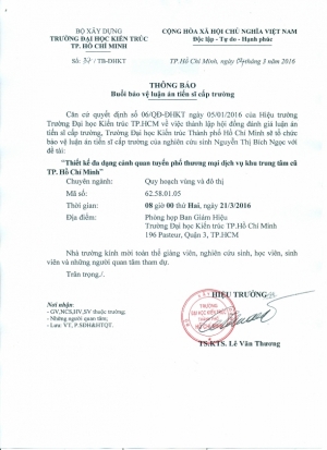 Buổi bảo vệ luận án tiến sĩ cấp trường của NCS Nguyễn Bích Ngọc sẽ diễn ra vào lúc 8h00 ngày 21/3/2016 tại Phòng họp Ban giám hiệu - Trường Đại học Kiến trúc Thành phố Hồ Chí Minh.